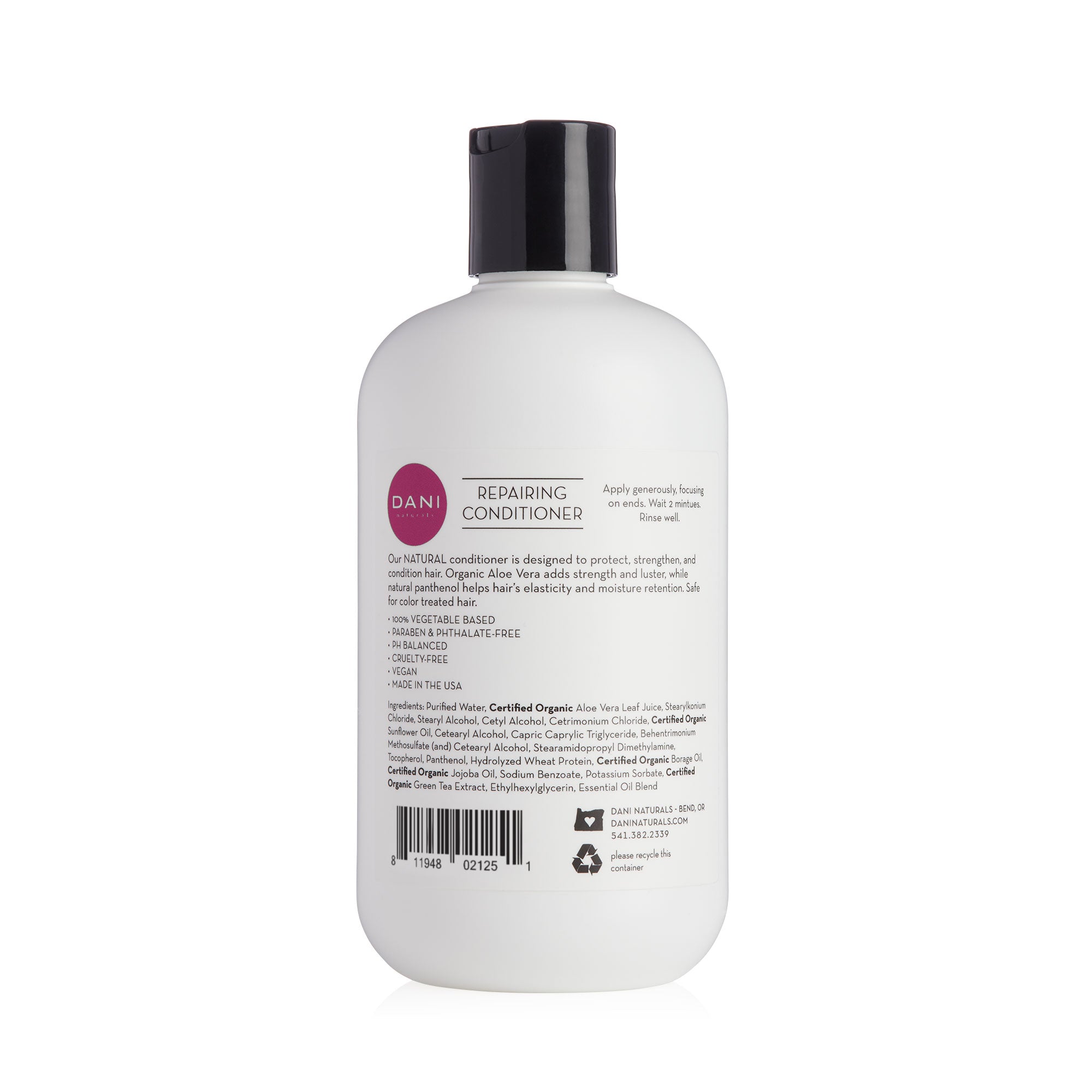 DANI Naturals Repairing Conditioner is made with 100% natural vegetable oils and certified organic ingredients, designed to protect, strengthen, and condition hair. Natural panthenol (a vitamin B derivative) helps improve hair's elasticity and moisture retention, while organic aloe vera adds strength and shine. Our rich, thick formula is wonderful for all hair types, and safe for color-treated hair.
